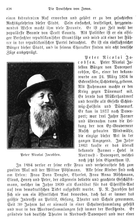![]() The GERMANS of IOWA And Their Achievements (Die Deutschen von Iowa und deren Errungenschaften) Extract of Biographical Sketches By Jim W. Faulkinbury, C.G.R.S. Certified Genealogical Record Specialist Deutschen von Iowa Introduction Based on the Book by Jospeh Eiboeck titled: "Die Deutschen von Iowa und deren Errungenschaften" (Des Moines, Iowa: des Iowa Staats-Anzeiger, 1900) FHL Microfilm number for this book is #1036447 (Family History Library, Salt Lake City) Amend, Conrad - born 3 Jan 1849 Steinau in Kurhessen; married (1) Maria Kronig (died 30 Jun 1897) 25 Jan 1872; 12 children by 1st marr., 9 living: Wilhelm, Johann, Georg, Edward, Gustav, Emma, Hermann, Albert, and Arthur; married (2) Adelheide Schlosser 14 Apr 1898; 1 child by 2nd marr.: Maria; resident Des Moines, Iowa. [p.621] Andersen, H.H. - born 18 Dec 1826 in Dorfe Gulde, Angeln; immigrated 1851; married 1854 Maria A. Thomsen; 5 children: Willie, Anna (Mrs. C.H. Klenze), Clara (Mrs. W.T. Klenze), Richard, and Louise; resident Davenport, Iowa. [p.422] Appel, Wilhelm - born 4 Mar 1867 in Büdingen, Hessen-Darmstadt; immigrated 1887; resident Des Moines, Iowa. [p.649] Arnemann, Alfred - born 15 Dec 1835 Elbingen, Hannover; resident Guttenberg, Iowa. [p.206] Arnold, Christoph - born 24 Feb 1822 in Niedernhall, Oberant Künzelsau, Württemberg; resident Fort Dodge, Iowa. [p.705] Aulmann, William - born 29 Apr 1852 in Burlington, Iowa; son of Adam and Theodore (Pulch) Aulmann who immigrated 1849 [Adam was born 11 Dec 1821 in Mühlen, Nassau]; married 1881 Lucy Welcome of Keokuk, Iowa; 4 children: Bertha, Flora A., William Grover, and Hermann E., resident Des Moines, Iowa. [p.648] Bank, Henry - born 23 Oct 1843 in Adensen, Hannover; son of Heinrich and Julia (Gollmart) Bank; married 1 May 1869 Maria Risser; 7 children: Louise, Marie, Hermann, Heinrich, Dorothea, Katharine, and Elise; resident Keokuk, Iowa. [p.319] Baumann, John F. - born 10 Nov 1820 in Crailsheim, Württemberg; immigrated 1847; married 1847 Philadelphia PA Barbara Wolpert; 5 children, 2 living: George and John ; died 30 Nov 1893 in Marshalltown, Iowa. [p.670] Bechtele, Peter - born 9 Jul 1827 in Kempten, Bavaria; immigrated Apr 1854; resident Council Bluffs, Iowa. [p.558] Beck, Conrad - born 26 Nov 1835 in Hemmendorf, Amt Rottenburg, Württemberg; immigrated 1854; resident Des Moines, Iowa. [p.618] Becker, Alois - born 9 Mar 1854 in Calcar, Kreis Cleve near Niederheim; married 19 Aug 1879 Sophie Louise Viemann; 4 children: Karl, Ferdinand, Henrietta, and Wilhelmina; resident Council Bluffs, Iowa. [p.250] Becker, Gustav - born 8 Dec 1848 in Tschirnau, Kreis Guhrau; immigrated 1869; married 20 Jun 1872 Wilhelmine Ruehle; 5 children, 3 living: Oswald, Lina, and Alice; resident Davenport, Iowa. [p.462] Beiter, Nikolaus - born 21 Mar 1847 in Strassberg, Hohenzollern-Sigmaringen, Prussia; immigrated Jul 1866; resident Carroll Co., Iowa. [p.687] Bergmann, Prof. Ignaz - born 9 Mar 1842 in Wormeln, Kreis Warburg, Westphalia; resident Fort Madison, Iowa. [p.329] Bernhard, Eduard - immigrated 1854 at age 36; resident Fort Madison, Iowa. [p.329] Berwald, John - born 28 Jul 1852 in Davenport, Iowa; married Sophie Brauch; 2 children: Anna and Walther; resident Davenport, Iowa. [p.461] Bicklen, Gottlob H. - born 16 Mar 1830 in Württemberg; son of Ludwig Bicklen; immigrated 1853; married (1) 24 Jul 1853 Christine Hammer (died Mar 1868), dau John H. Hammer; 2 children by 1st marr.: Christine (w. James S. Klein) and William; married (2) fall of 1868 Christine Paule, dau Jacob Paule; 7 children by 2nd marr. [*** the text indicates 6 children but lists 7 names]: Clara, Regina, Albert Ludwig, Oscar Philipp, Martha Mary, Alma, and Maria; resident Burlington, Iowa. [p.380] Biermann, Gustav - born 2 Dec 1865 in Gross-Wanzleben, Provinz Sachsen, Prussia; immigrated 16 Jan 1889; married 19 Feb 1895 Carolina Dieterich, dau John F. Dieterich; 2 children: Elisabeth and Carl; resident Marshalltown, Iowa. [p.673] Blohm, Georg A. - born 1850 in Schleswig; immigrated 1870; resident Madison Co., Iowa. [p.661] Boehler, Charles A. - born 31 Aug 1836 in Waldshut, Baden am Rhein; immigrated at age 17; married 12 Jun 1859 in New York to Louise Brutsche; 7 children, 5 living: Louise (w. Fred. Kuhlmann), Albert, Anna (w. Dr. Albert Anderson), Antoinette (w. Jacob O'Neil), and Andreas F.; resident Des Moines, Iowa. [p.627] Bohlander, Rev. George - born 6 Jun 1861 in Clinton Co., Illinois; resident Council Bluffs, Iowa. [p.551] Bormann, Christ. - born 6 Feb 1826 in Pirmasens in the Rheinprovinz; immigrated 1854 with wife Friederika Keller; died 13 Feb 1891; children: Lina (w. Wm. Hiles), Mina (w. Ed. C. Jandt), Eliza (w. Carl Hecker), Charles A.; resident Sioux City, Iowa. [p.726] Carstens, J.H. - born 3 Jan 1844 in Schleswig-Holstein; immigrated 1866; married 19 Jun 1879 Anna C. Hinrichsen; 2 children: the w. John J. Hoffmann and Laura; resident Davenport, Iowa. [p.692] Carstensen, Edlef H. - born 15 Oct 1846 in Stedesand, Schleswig; immigrated Sep 1871; married 1874 Elsebe Volkmann; 3 children: Emilie, Hermann, and Lilla; resident Clinton, Iowa. [p.497] Claussen, Ernst - born 2 Mar 1833 in Heide, Holstein; son of Hans Reimer Claussen; 1st wife died by 1875; married 2) 1876; 3 children: Alfred, Hermann, and Elfrieda; resident Lyons, Iowa. [p.414] Claussen, Hans Reimer - born 23 Feb 1804 in Fedringer, Ditmarschen, Holstein-Schleswig; married 10 May 1832 Anna Rahbeck, dau Claus D. Rahbeck; resident Davenport, Iowa. [p.409] Conradi, Georg - born 26 Sep 1850 in Michelbach, Hessen-Nassau; immigrated 1868; married 8 Oct 1893 Katie Stollberg, a sister of Mrs. Phillip Conradi; 3 children; resident Des Moines, Iowa. [p.630] Dessel, H.A. - born 27 Jan 1861 in Fürstenthum, Waldeck; immigrated 1869; married 1884 Ottilie Witt of Davenport, Iowa; 11 children; resident Ida Co., Iowa. [p.709] Dietsch, Gustav - born 21 Aug 1865 in Treuen, Sachen; resident Potville, Iowa. [p. 266] Dietz, Phillip - born 10 Jan 1838